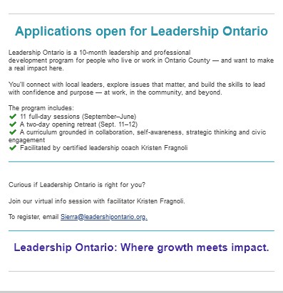 Home › Community News Releases › Applications Open for Leadership Ontario Applications Open for Leadership Ontario July 29, 2025 Community Submission Community News Release Share Stay Informed Finger Lakes news, delivered to your inbox every morning. First nameLast nameEmail addressZIP codeSubscribe
