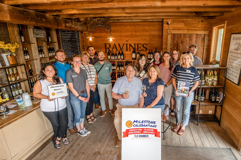 Ravines Wine Cellars was founded in 2000 by the husband and wife team, Morten and Lisa Hallgren. Morten is a trained oenologist/winemaker from France. Famed for their bone-dry, mineral-laden Rieslings grown on over 130 acres of estate vineyards, Ravines purchased and started their primary business on the historic White Springs Farm in Geneva. Today, Ravines Wine Cellars operates two tasting rooms, one on Seneca Lake and their second overlooking Keuka Lake. They have received numerous accolades and industry awards and have been included in countless articles and publications. The Member Milestone Event was an opportunity to reflect on their many achievements and accomplishments, where Chamber Board Members and Ambassadors were on hand to congratulate them before taking part in a celebratory group photo during their event photo shoot.