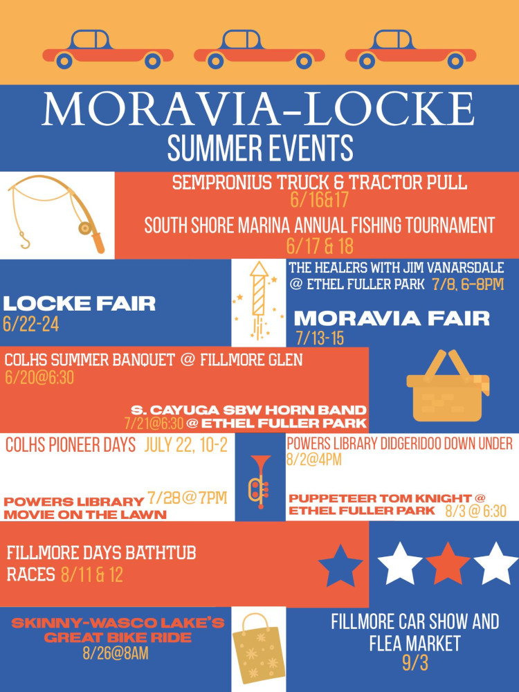 Home › Community News Releases › Moravia-Locke Summer Events Moravia-Locke Summer Events June 22, 2023 Community Submission Community News Release Share Photo by form PxHere Moravia and Locke have released their summer events taking place now through September. Stay Informed Finger Lakes news, delivered to your inbox every morning. First nameLast nameEmail addressZIP codeSubscribe