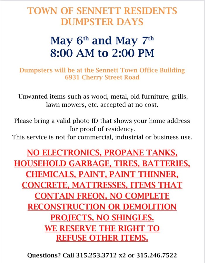 The Town of Sennett has announced two dumpster days for next month.