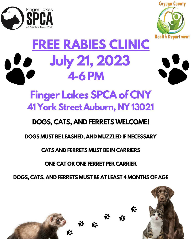 The Finger Lakes SPCA of Central New York will hold a free rabies clinic Friday from 4:00-6:00p at its Auburn location.