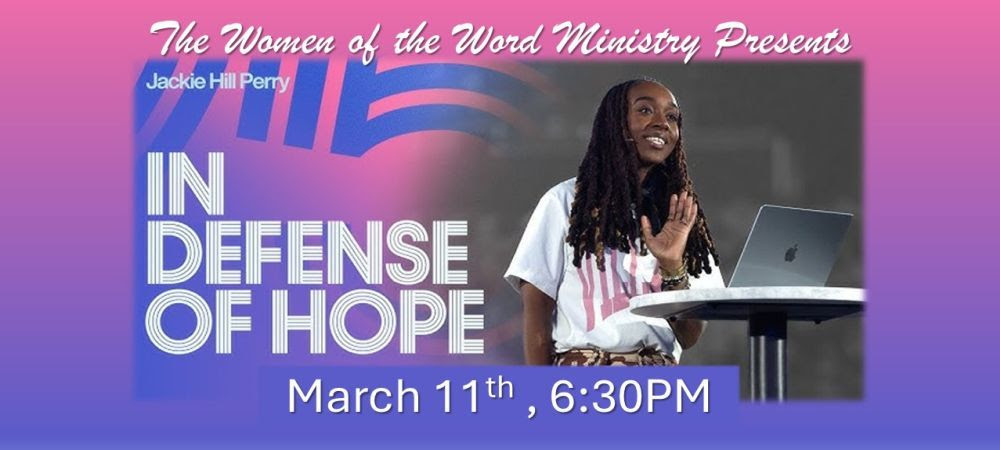 A free one-night Bible study for women at Penn Yan Bible Church. This is a video-based teaching from Jackie Hill Perry as she spoke at the 2025 Passion Conference. “In Defense of Hope”. Jackie is an author, poet, Bible teacher and hip-hop artist. Contact our office at 315-536-4523 for more information.