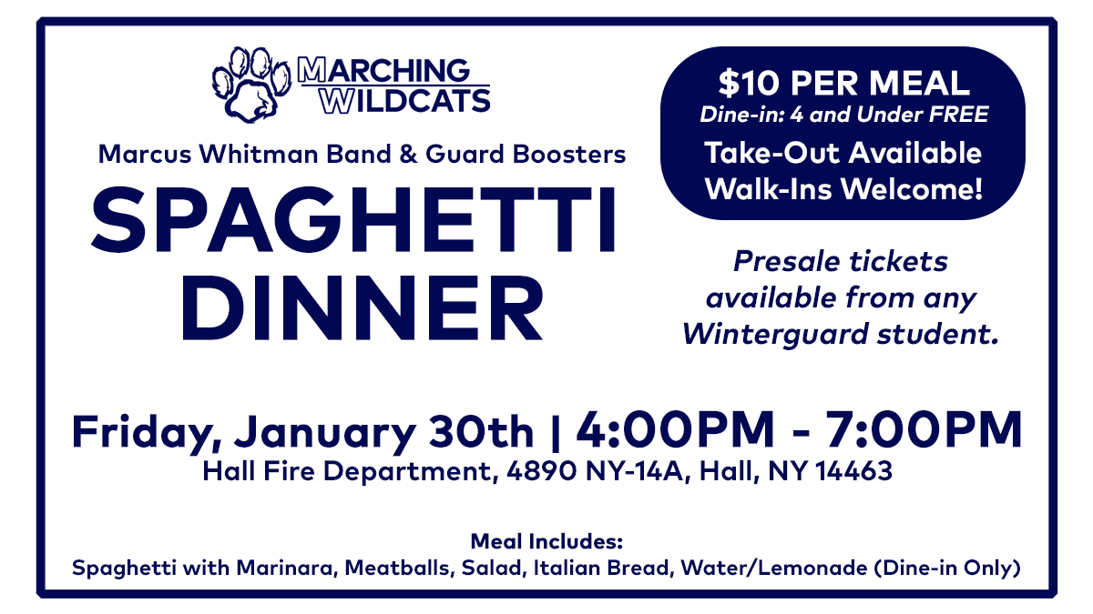 Join us from 4-7PM on Friday, January 30th at the Hall Fire Department for spaghetti with marinara, meatballs, salad, and Italian bread for $10 per meal. Take-out is available and walk-ins are welcome! Children four and under are free when dining in.