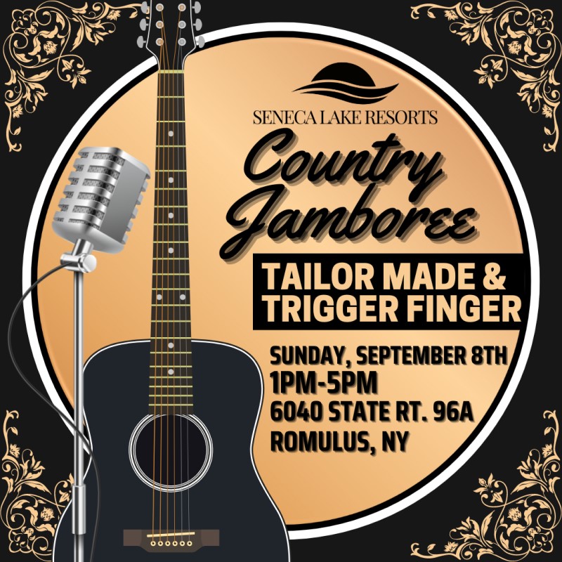 Seneca Lake Resorts will be putting on a Country Jamboree Sunday, September 8th from 1pm to 5pm at their beautiful lakeview music venue, The Vista, located at 6040 State Route 96A in Romulus, featuring two bands and three food trucks.