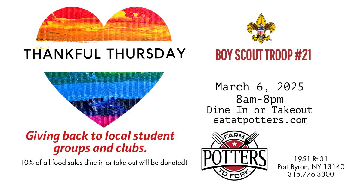 Every Thankful Thursday 10% of food sales are donated to youth groups and organizations. Dine in or Take out at Potters Farm to Fork in Port Byron, NY