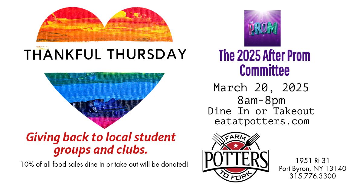 Every Thankful Thursday 10% of food sales are donated to youth groups and organizations. Dine in or Take out at Potters Farm to Fork in Port Byron, NY