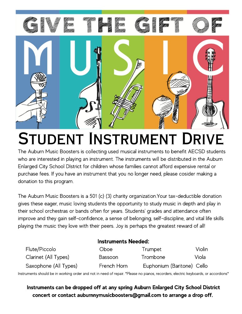 Auburn Music Boosters are looking to make playing an instrument more accessible to students across the district. The group has announced it will be collecting instruments for families who cannot afford to rent or purchase one.