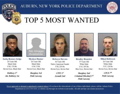 The Auburn Police Department emphasized that members of the public should not attempt to apprehend any of the individuals listed. Anyone with information on their whereabouts is encouraged to call the department at (315) 253-3231 or submit an anonymous tip through the department’s website or social media channels.