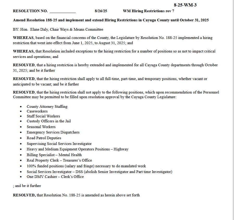 The hiring pause applies to most county departments and positions, though several roles are exempt, including jail custody officers, road patrol deputies, 911 dispatchers, fully funded positions necessary for mandated work, county attorney staff, caseworkers, seasonal employees, and staff social workers. Other exempt positions include a billing specialist in the Office of Mental Health, a DMV cashier, highway equipment operators, a real property tax clerk, and social services investigators.