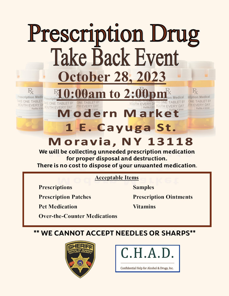 The sheriff’s office, in partnership with CHAD, will also hold a drug takeback day from 10:00a-2:00p.