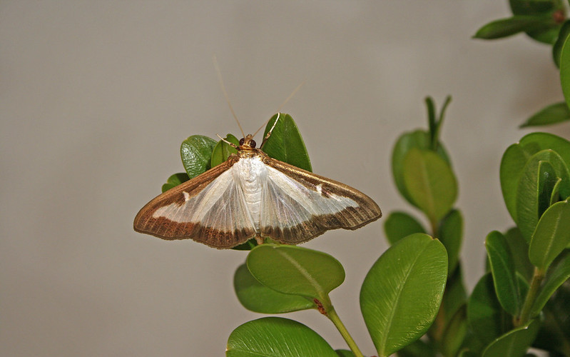 Adult Box Tree Moths generally have white bodies with a brown head and abdomen. Their wings are white and slightly iridescent, with an irregular thick brown border. Some adults have completely brown wings with a small white streak on each forewing. Males and females can show both colorations.