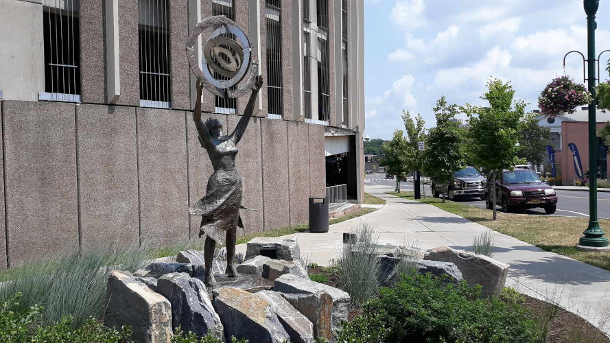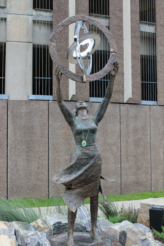 A project years in the making, Sky Woman is an homage to the Cayuga creation story. The sculpture features a bronze woman holding concentric steel rings representing the sun, earth, and sky. The base of the work resembles a tortoise shell.