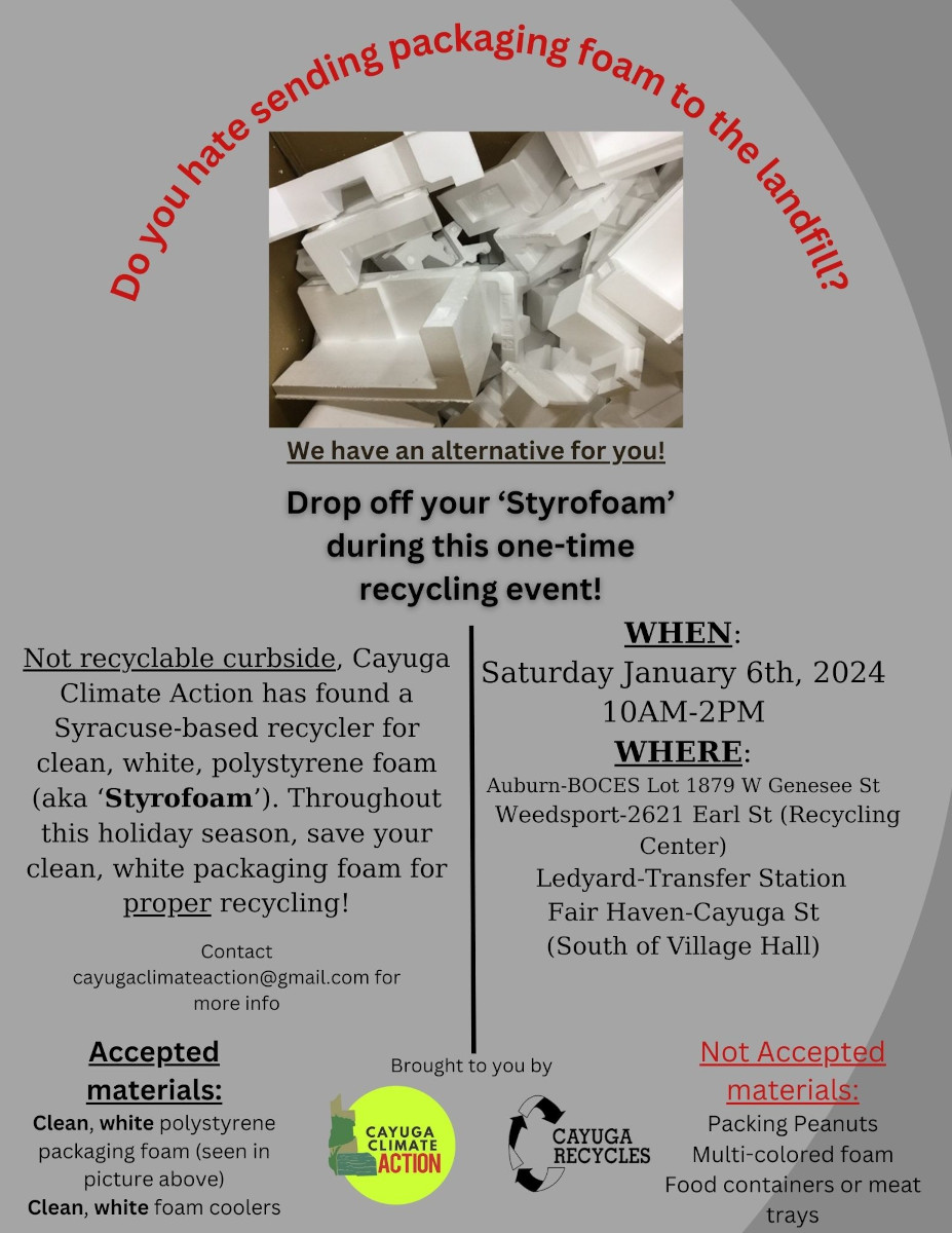 Cayuga Climate Action (CCA) is holding its first post-holiday styrofoam recycling event. On January 6, from 10:00a-2:00p, you can drop off used white polystyrene from any gifts you’ve received at locations in Auburn, Fair Haven, Ledyard, and Weedsport for proper disposal.