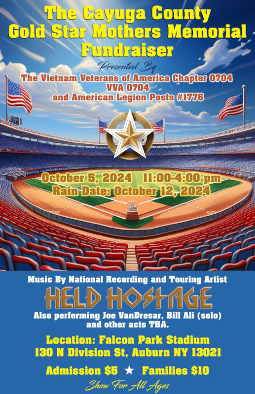 An upcoming concert at Auburn’s Falcon Park will help raise money for a Gold Star Mothers Memorial in Cayuga County.