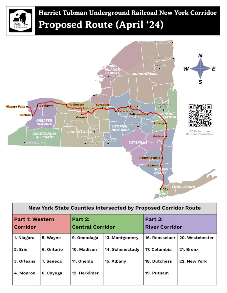 The Harriet Tubman Underground Railroad Corridor is a proposed 500-mile driving route through the linking sites associated with Tubman and the Underground Railroad. Beginning in New York City, the corridor would travel north to Albany before heading to Niagara Falls. On its way to Niagara Falls, the route would pass through, Syracuse, Auburn, Geneva, and Rochester, among others.
