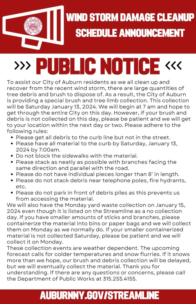 The City of Auburn is providing a special collection day to deal with debris from Tuesday’s wind storm.