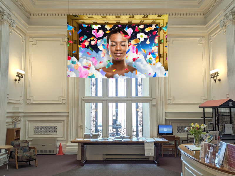 In celebration of Juneteenth, Cosmic Black Joy by Arthur Hutchinson, also known as Arthur the Artist, is planned to be installed at the Seymour Library where it will remain for the summer. The work features a series of digital collages printed onto fabric to create tapestries that will be suspended throughout the library. An outside mural will also be hung above the library’s front entrance.