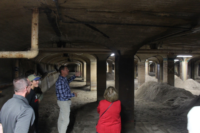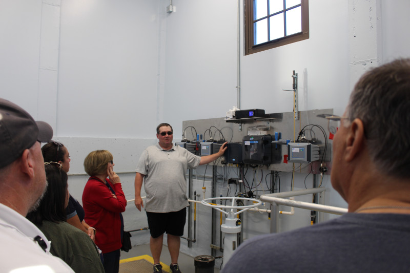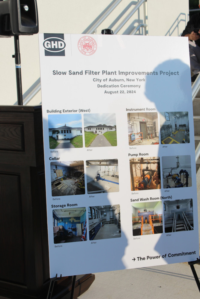 Mayor Jimmy Giannettino speaks at the slow sand filtration building. (Ed Vivenzio, Finger Lakes News Radio)Director of Municipal Utilities Seth Jensen speaks at the slow sand filtration building. (Ed Vivenzio, Finger Lakes News Radio)Seth Jensen reveals a new plaque celebrating the renovations to the facility. (Ed Vivenzio, Finger Lakes News Radio)Original plaque marking the completion of the slow sand filter plant. (Ed Vivenzio, Finger Lakes News Radio)New plaque celebrating renovations to the facility. (Ed Vivenzio, Finger Lakes News Radio)John West gives a tour of the upgraded facility.(Ed Vivenzio, Finger Lakes News Radio)Fire Chief Mark Fritz and City Ambulance Director of Operations Kezia Sullivan tour the slow sand filtration pits. (Ed Vivenzio, Finger Lakes News Radio)(Ed Vivenzio, Finger Lakes News Radio)a poster showing before and after photos of the rehabilitation. (Ed Vivenzio, Finger Lakes News Radio)