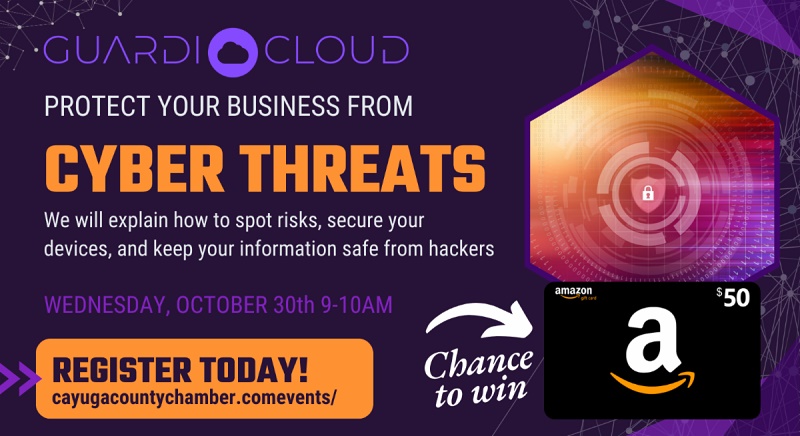 The Cayuga County Chamber of Commerce is hosting Guardicloud Founder and CEO Kieran McManus, who will offer an in-person seminar where you’ll be taught the easy steps to protect your business from cyber threats.