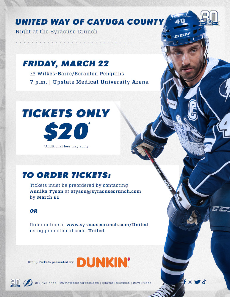 The United Way of Cayuga County’s Night at the Syracuse Crunch may not be until March but tickets are now available.