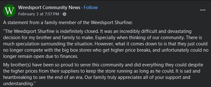 A family member announced on the “Weedsport Community News” Facebook group that the Shurfine store is closing indefinitely due to financial struggles. They called it a devastating decision and blamed competition with big-box retailers.