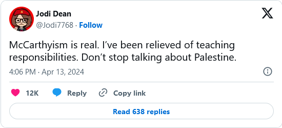 The piece “Palestine Speaks for Everyone” was posted online by Verso Books, a self-described left-wing publishing house, and included Jodi Dean writing, “Who could not feel energized seeing oppressed people bulldozing the fences enclosing them, taking to the skies in escape, and flying freely through the air?”