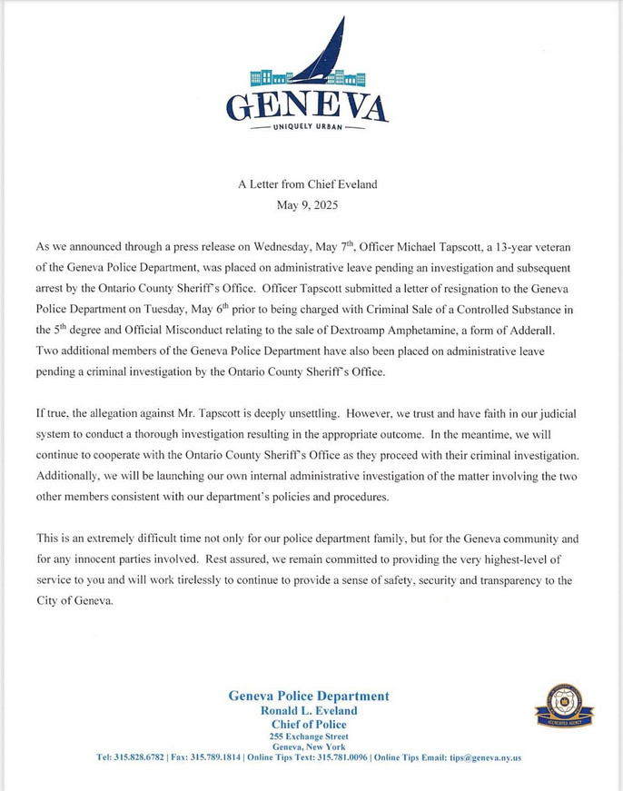 Chief Eveland called the allegations against Tapscott “deeply unsettling” and reaffirmed that the Geneva Police Department is cooperating fully with the Sheriff’s Office. He also noted that the department will be conducting its own internal administrative investigation, as required by policy.