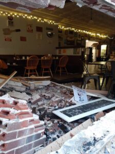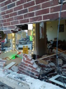 The crash left a large hole in the brick building.