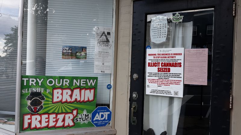 The signs read: “Illicit cannabis has been seized and this location must immediately cease the sale of unapproved and unauthorized cannabis products.”