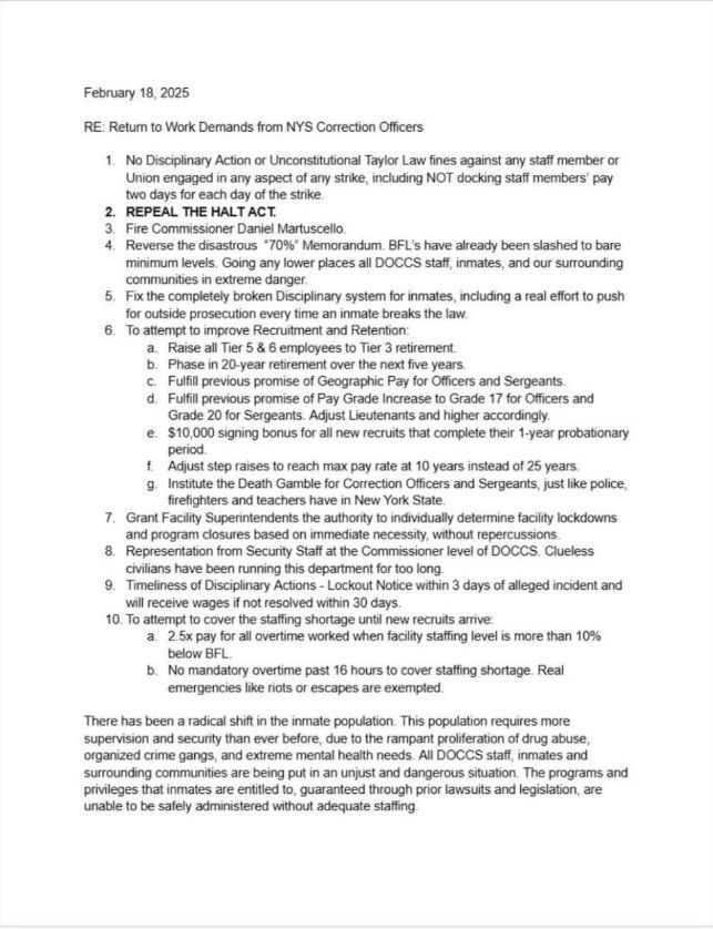 Finger Lakes Daily News has obtained a copy of the list of work demands being made by the Corrections Officers in order to return to their jobs: