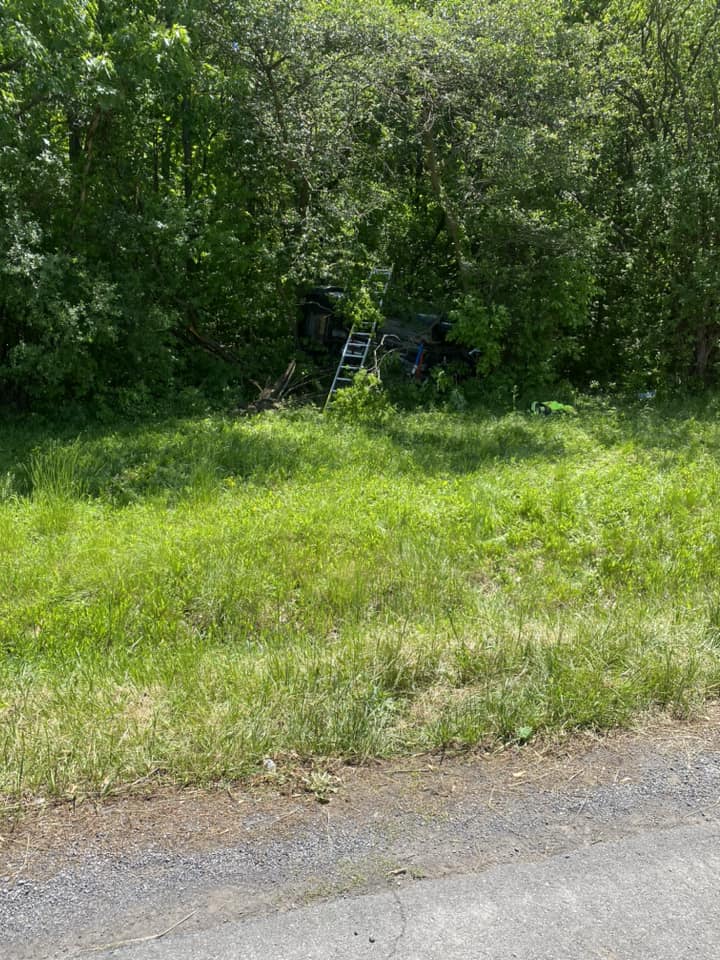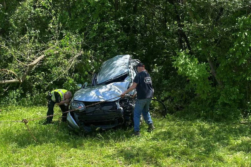 Emergency crews discovered an SUV well off the road on its side in the trees at around 11:30 a.m. One person was found inside and firefighters immediately went to work on stabilizing the vehicle and removing them.