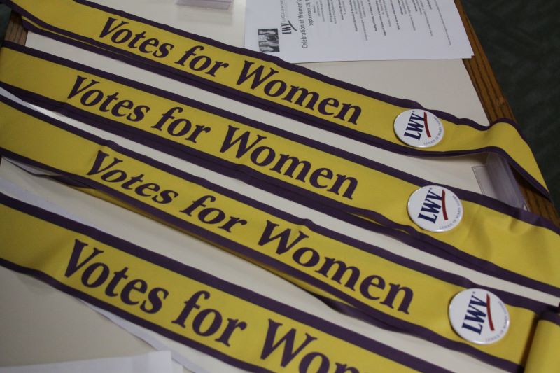 Town of Tyre Town Justice, Kathleen Jans-Duffy, (left) talks with the great-great granddaughter of Elizabeth Cady Stanton Coline Jenkins in Tenafly, N.J.