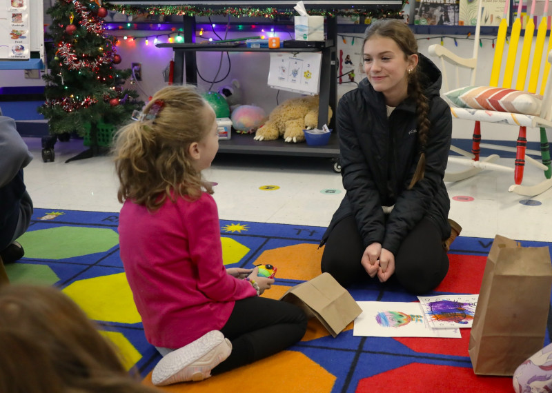 Finally, facing inclement weather, the day arrived. McConnon’s class trekked across campus with small gift bags, a student’s name on each with their creation inside. In the Elementary building, the kindergarteners worked feverishly on a morning activity, coloring ‘thank you’ notes for their older pals while awaiting their arrival.