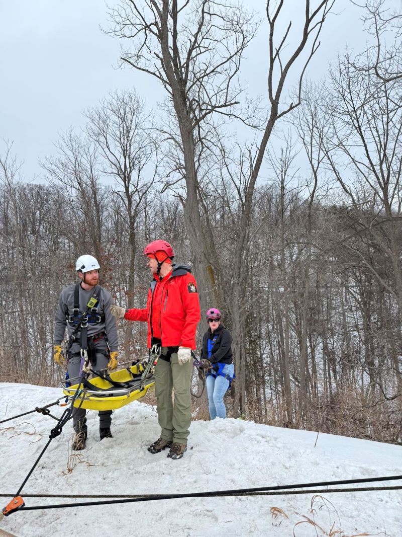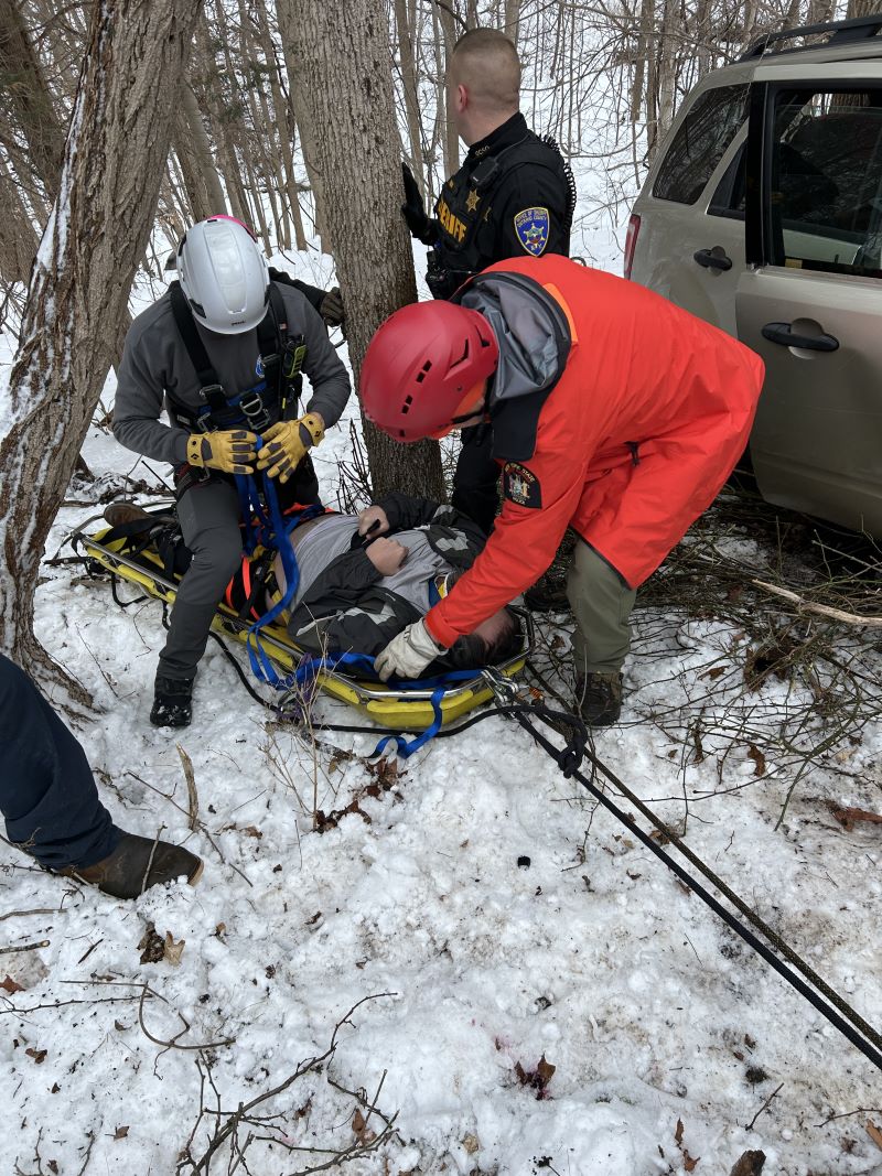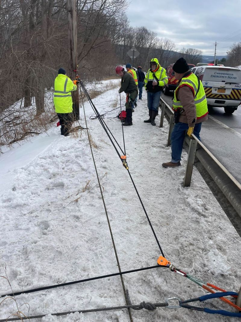Canandaigua ALS secured Ryan Robinson and because of the slick conditions and unsure footing at the Town of South Bristol location, a rope rescue was deemed the most effective way to pull him to safety. DEC Forest Rangers worked with the Ontario County High Angle Team and the Ontario County Sheriff’s Department to pull Robinson to the roadway where they were met by an ambulance.