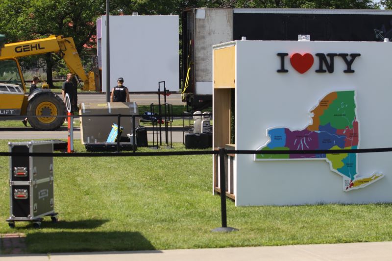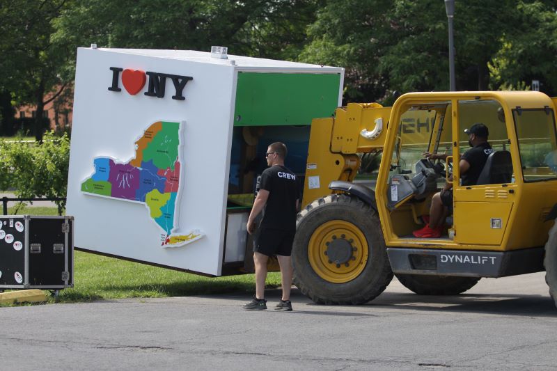 Workers Friday unload one of the pods in Geneva that makes up the “I Love New York Experience Tour.” Photo by Greg Cotterill Finger Lakes Daily News.