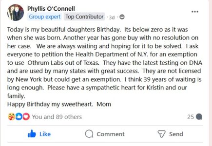 In a post on Facebook, Kristen’s mother is asking you to petition the New York State Health Department to allow a Texas lab to perform new DNA testing. The lab is not licensed by New York State but could be granted an exemption.