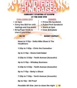 Make plans for the Ovid Fire Fundraiser at the Ovid Fire Department this Saturday. There will be a chili cook-off, prime rib and pulled pork dinners, and live music all afternoon.