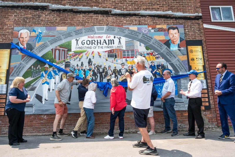 Titled “Bandstand,” a new mural that honors the history and legacy of the Gorham Pageant of Bands was revealed last Saturday. The mural featuring various uniforms worn by the Marcus Whitman Marching Wildcat Band, as well as tributes to late pageant founder Jack Bullock and longtime director Robert “Bob” Steele. It was painted by and designed in collaboration with Mural Mania, best known for their work creating the world’s longest mural trail along the Erie Canal.