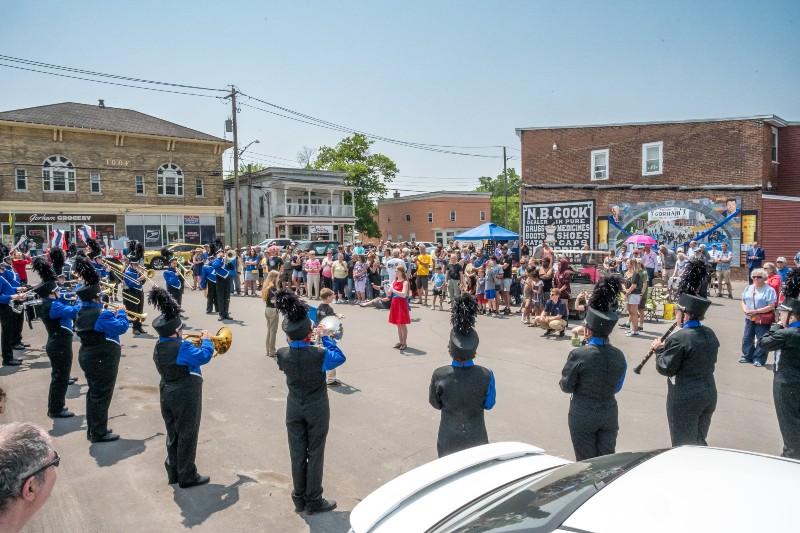 Held outside the Old Mill Restaurant on Main Street in Gorham, the celebration drew hundreds, featured complimentary refreshments provided by the Marcus Whitman Band & Guard Boosters, a performance by the Marcus Whitman Marching Wildcat Band, remarks from local leaders and organizers, and a ribbon cutting led by the family of Jack Bullock.