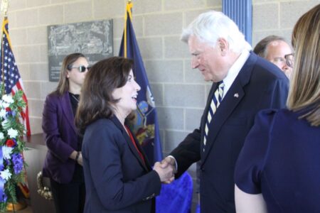 Former State Senator Michael Nozzolio greets Gov. Kathy Hochul at the New York State Veterans Cemetery-Finger Lakes. Photos by Greg Cotterill, Finger Lakes Daily News.