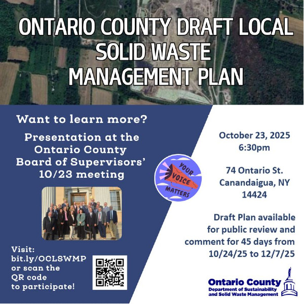 Ontario County will hold a public presentation of its updated Local Solid Waste Management Plan during the County Board of Supervisors meeting on Thursday. The meeting will take place at 74 Ontario Street in Canandaigua, and residents, businesses, and institutions are invited to attend and provide feedback.