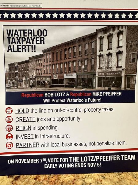 The political action committee, Responsible Solutions for New York, mailed a flyer to homes with the headline “Waterloo Taxpayer Alert!! The problem, the flyer features a picture of downtown Seneca Falls. The flyer supports Waterloo Republican candidates Bob Lotz and Mike Pfeiffer.