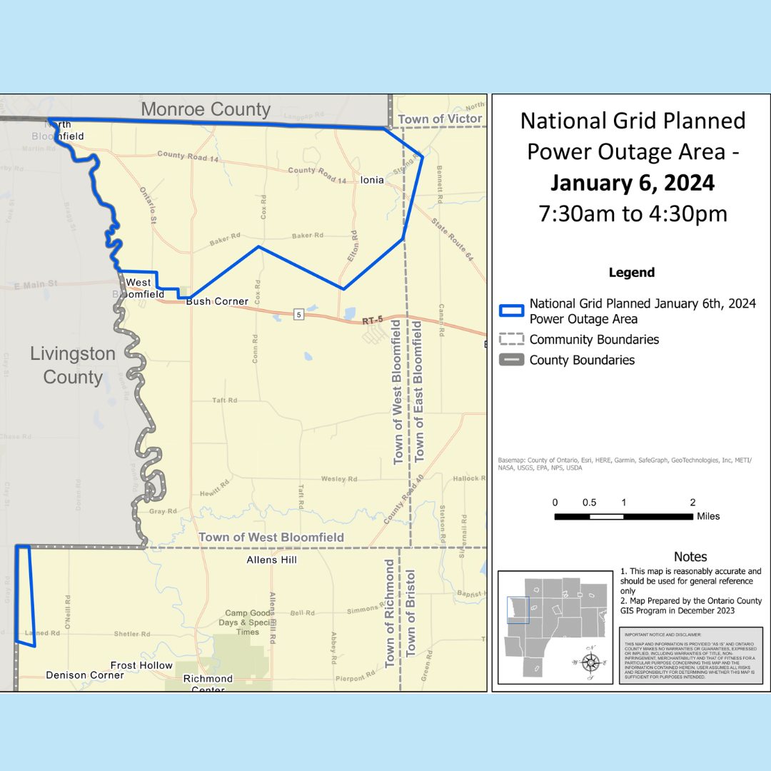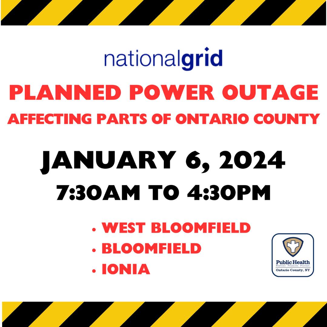 A planned power outage this weekend will affect portions of Ontario County. National Grid customers in West Bloomfield, Bloomfield, and Ionia will be impacted by Saturday’s disruption.