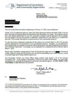 The Department of Corrections and Community Supervision posted a message on social media,and sent termination letters to those still on the picket lines, as well as a warning issued Sunday about the potential loss of health care benefits. DOCCS announced last night that the department has started terminating officers who have missed more than 11 consecutive shifts due to striking.