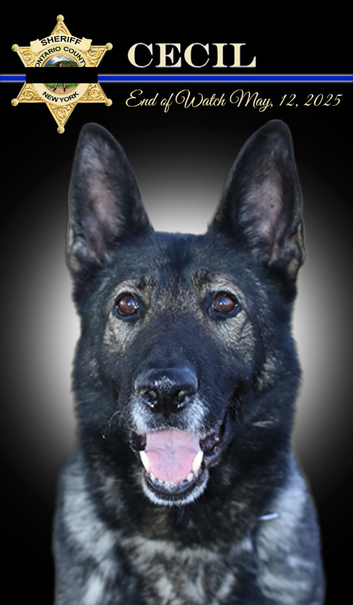 “It is with deep sadness that the Ontario County Sheriff’s Office announces the passing of retired K9 Cecil, who died peacefully on May 12, 2025, surrounded by his family and former handler Deputy Fitzgerald. K9 Cecil served the Ontario County Sheriff’s Office with distinction for 9.5 years, proving to be an invaluable partner in narcotics detection and officer protection. Known for his discipline, loyalty, and relentless work ethic, Cecil played a vital role in keeping both deputies and the community safe.