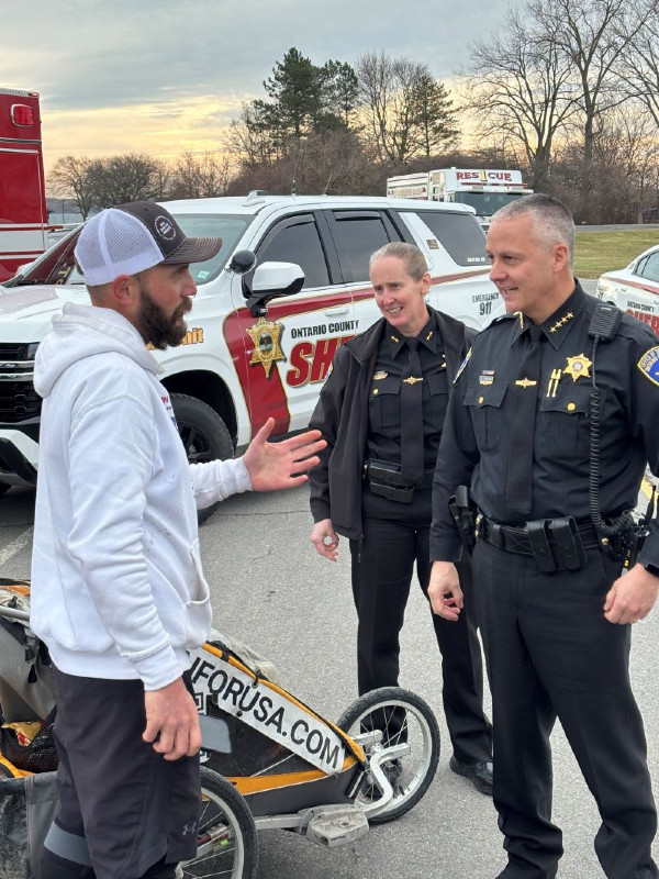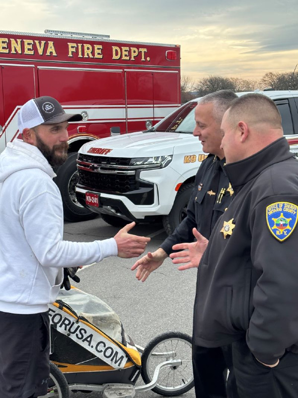 With members from the Geneva Police and Fire Departments, along with the Ontario County Sheriff’s Office, including Sheriff David Cirencione, and New York State Police set to guide him through the county, Coughlan greeted each as he made his way to Seneca Lake State Park on Routes 5 and 20. Coughlan said one of the goals he set for this run is to promote unity across the country.