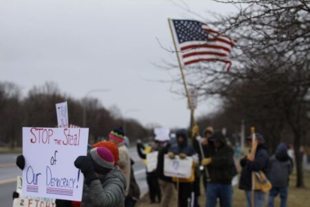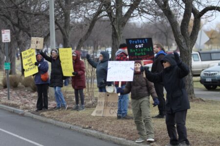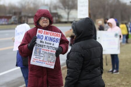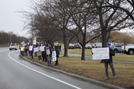 Just over a hundred people line up Saturday along Routes 5 & 20 near the Finger Lakes Welcome Center to protest cuts to federal departments and programs by the Trump administration.