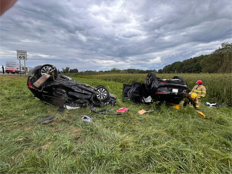 The Victor Fire Department says both cars were found off the road and upside down, with at least one person inside each vehicle. Firefighters worked to extricate the occupants.