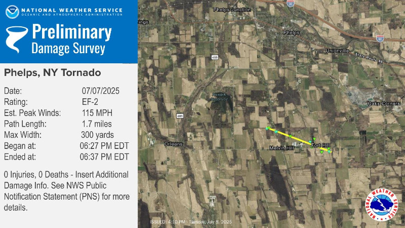 UPDATE: The National Weather Service has confirmed it was an EF-2 tornado that touched down in Phelps Monday night.