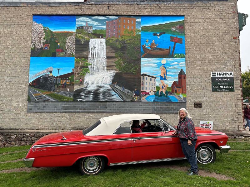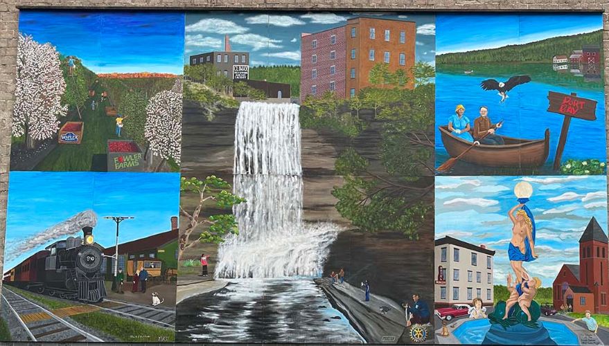 The town and village of Wolcott, the Wolcott Lions and Rotary clubs, the Wolcott Historical Society, and Mural Mania worked together on the mural installed on the Palace Theater. This 16′ x 32′ mural depicts several scenes of landmarks and the history of Wolcott and the surrounding area.